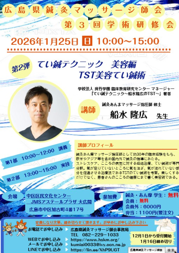 「広島県鍼灸マッサージ師会理事」として運営しています。 てい鍼テクニック〈美容編〉 ✨TST美容てい鍼術✨ 刺さない・きらない✨ やさしい刺激でリフトアップ・肌質改善を目指す 「美容てい鍼テクニック」を実技中心で学びます。 👩⚕️講師:船水 隆広 先生 (TSTてい鍼術考案者/著者) 🗓 2026年1月25日(日)10:00〜15:00 📍 JMSアステールプラザ(中区) 主催:広島県鍼灸マッサージ師会